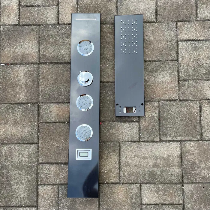 Panou de duș elegant și modern, negru, realizat din inox de calitate superioară 304. Echipat cu două tipuri de jeturi (duș tip ploaie și duș cu masaj), afișaj digital al temperaturii și iluminare LED pentru o experiență de duș specială. Include furtun de mână și intrare pentru cadă, ideal pentru montaj pe perete în baie.