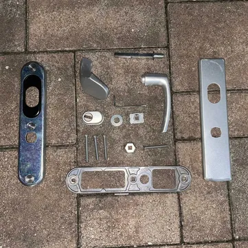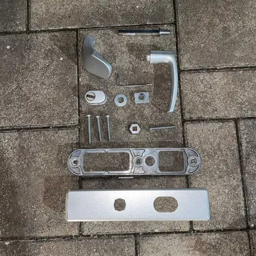 Vând set de mânere Abus pentru ușă de exterior, cu șild lung, format din mâner mobil (interior) și fix (exterior). Compatibil cu majoritatea sistemelor cu broască cu cilindru standard. Ideal pentru uși metalice sau PVC.